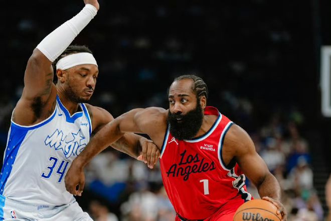 今天对阵魔术队这一场,可以完美概括快船队本赛季至今的表现。进攻端毫无亮点,防守端千疮百孔。第三节还没打完,就已经是溃败之势了。最终,遭遇了一场大败。全队的低迷发挥中,36岁的哈登成了唯一的亮点。