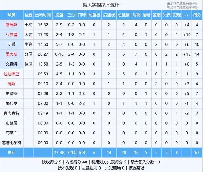 二号功臣(拉拉维亚):替补上来5中4得到9分5篮板1抢断,里弗斯下场休息阶段是他与艾顿一起连续命中关键球才让湖人守住领先,领先二号功臣!
