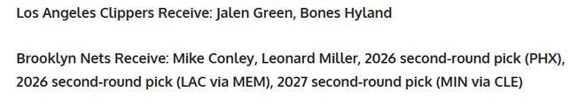 篮网得到:获得迈克・康利(森林狼)、伦纳德・米勒(森林狼)、2026年第二轮选秀权(来自太阳)、2026年第二轮选秀权(来自快船)、2027年第二轮选秀权(来自森林狼)