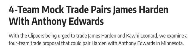 尽管快船近况十分糟糕,但在25-26赛季开局阶段,快船的当家球星哈登状态火热,各项命中率甚至来到生涯巅峰的水准。他的强势复苏,本该快船本赛季最值得期待的积极信号,然而遗憾的是,这也是球队目前唯一的亮点。截至目前,快船仅取得6胜16负的惨淡战绩,排在西部倒数第二的位置。伴随保罗被遣送回家,球队内部似乎已经出现崩塌迹象。在这样的情况下,外界普遍认为快船需尽快推动交易,利用哈登与伦纳德还具备一定的交易价值,尽可能完成新老交替,以扭转颓势。此前,火箭队曾被视为哈登的潜在下家,但BleacherReport记者丹・法瓦尔提出了一套更具吸引力的交易方案,鉴于森林狼对明星控卫的迫切需求,他设计了一笔涉及四支球队的重磅交易,助力森林狼引进哈登。