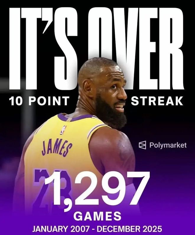是的,詹姆斯连续1297场得分上双的纪录