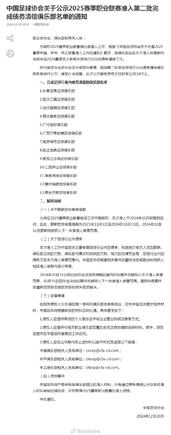 中国足协公示2025赛季职业联赛准入第二批完成债务清偿俱乐部名单,此前不在第一批名单里的长春亚泰、武汉三镇、沧州雄狮、梅州客家、广州、广西平果哈嘹、南京城市、延边龙鼎、黑龙江冰城、江西庐山、湖南湘涛、赣州瑞狮、泰安天贶全员上榜,相当于所有三级职业俱乐部都进行了完成债务清偿的公示。 ​​​