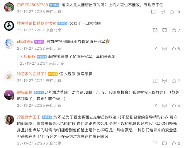 国安球迷愤怒写道:“丢人现眼!”;“:不算特殊时期的话,5年了才有机会踢洲际比赛。这就是你们的态度?这不是技战术的问题,这是态度的缺失和管理的失职!”:“不想踢就弃权完事儿,别把球迷当傻子!”