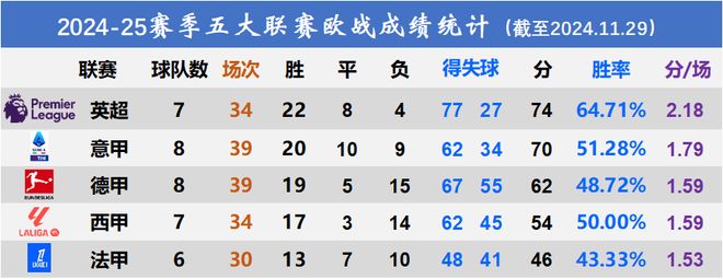 这是欧冠欧联第五轮(欧协联第四轮)结束后,五大联赛球队的整体成绩: