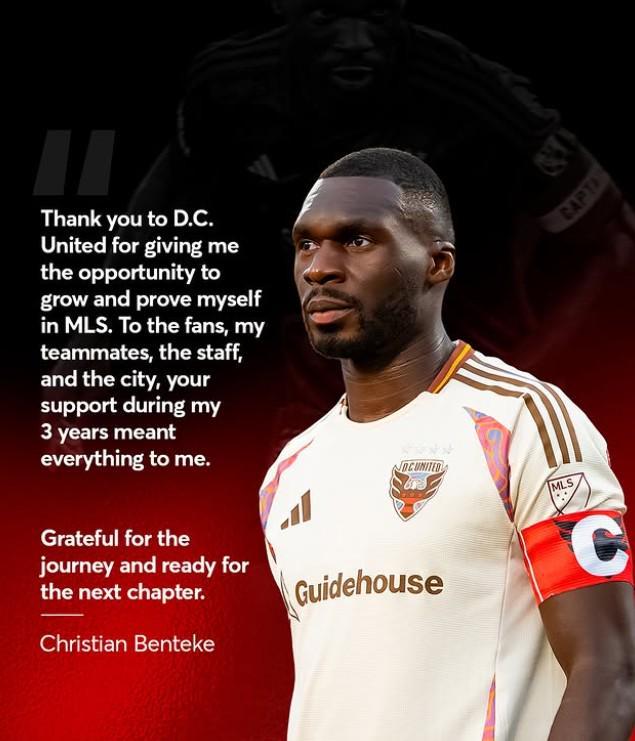 本特克表示:感谢华盛顿特区联队给了我在美国职业足球大联盟成长和证明自己的机会。致球迷、我的队友、工作人员和这座城市,在这三年间,你们的支持对我意义非凡。